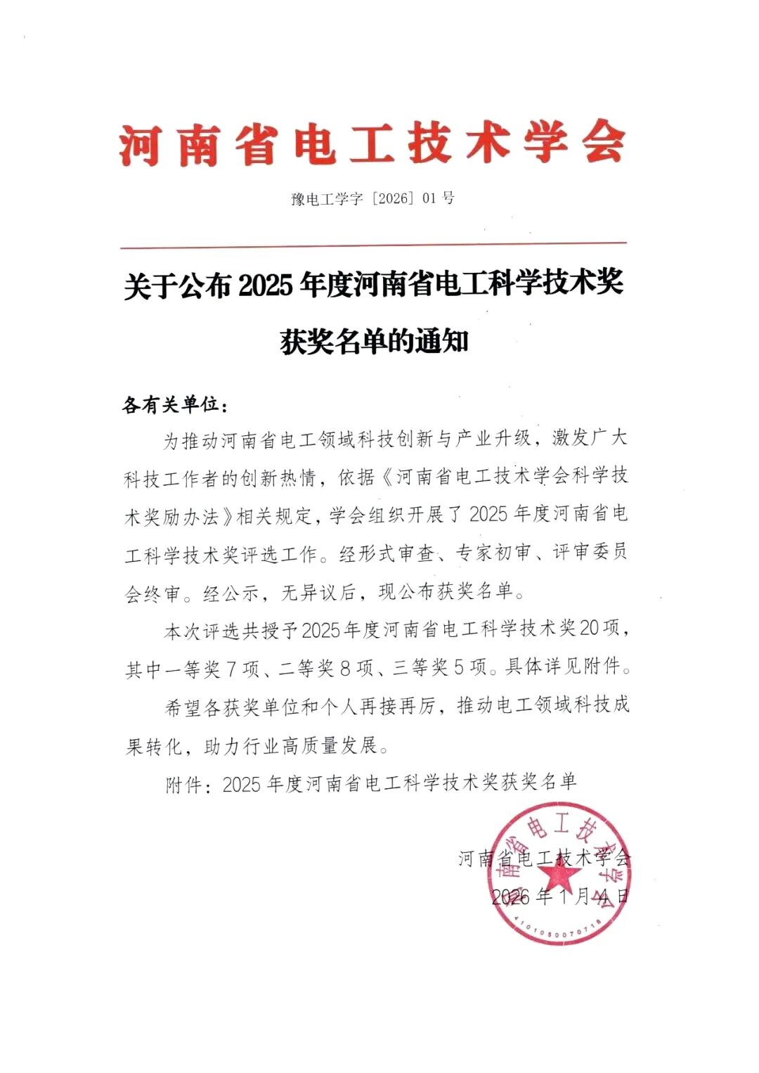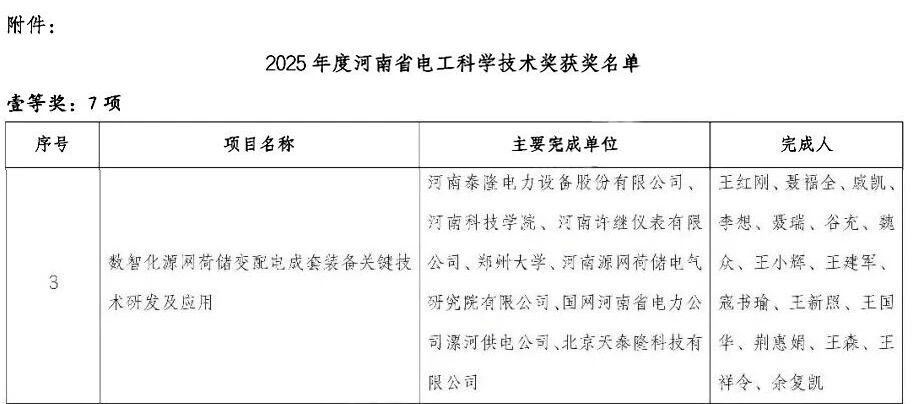 1月4日,从河南省电工技术学会传来喜讯,由河南泰隆电力设备股份有限公司牵头,联合河南科技学院、河南许继仪表有限公司、郑州大学、河南源网荷储电气研究院有限公司、国网河南省电力公司漯河供电公司、北京天泰隆科技有限公司共同研发的“数智化源网荷储变配电成套装备关键技术研发及应用”项目,荣获河南省电工科学技术壹等奖,为泰隆电力2026年科技创新征程再添辉煌篇章!