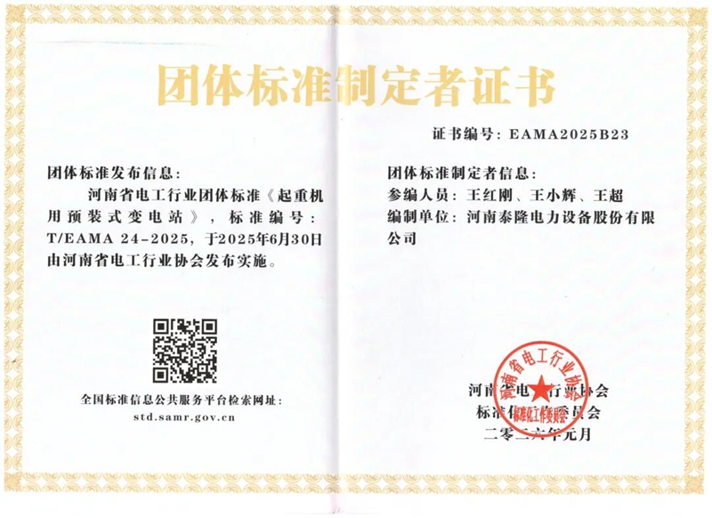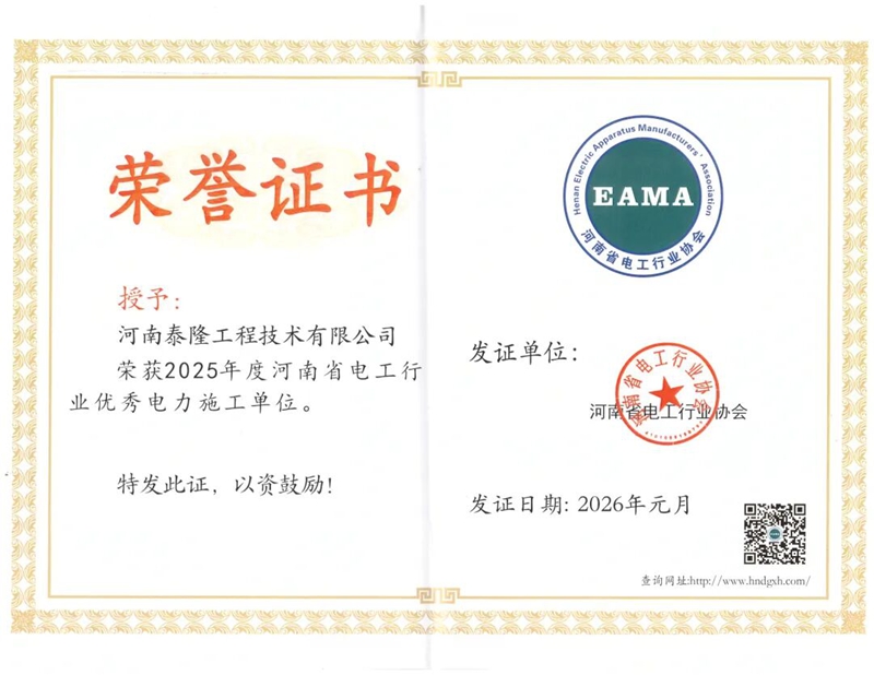 1月24日,2025年度河南省电工行业协会总结表彰大会暨迎新春联谊会在郑州召开。会上,2025年度河南省电工行业评优结果正式揭晓,河南泰隆电力设备股份有限公司与河南泰隆工程技术有限公司双双获奖!其中,河南泰隆电力设备股份有限公司荣获“优秀电力物资生产单位”称号,河南泰隆工程技术有限公司摘得“优秀电力施工单位”荣誉。此外,公司起草的《起重机专用预装式变电站》团体标准顺利通过审核并正式发布。未来,公司将持续创新,为推动行业高质量发展贡献更多力量!